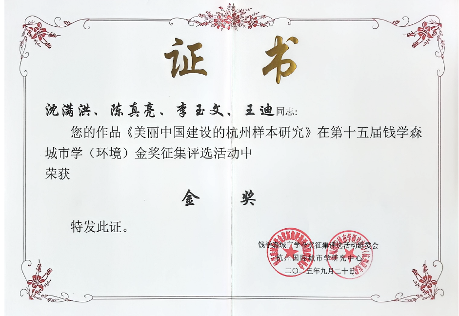 9月21日上午,中国城市学年会·2025”暨“天元教育论坛·2025”在杭州举行开幕式,颁发了第十五届钱学森城市学金奖。由beat365官方网站生态文明研究院院长沈满洪教授及团队成员陈真亮教授、李玉文教授、博士生王迪等合著的《美丽中国建设的杭州样本研究》荣获第十五届钱学森城市学(环境)金奖。