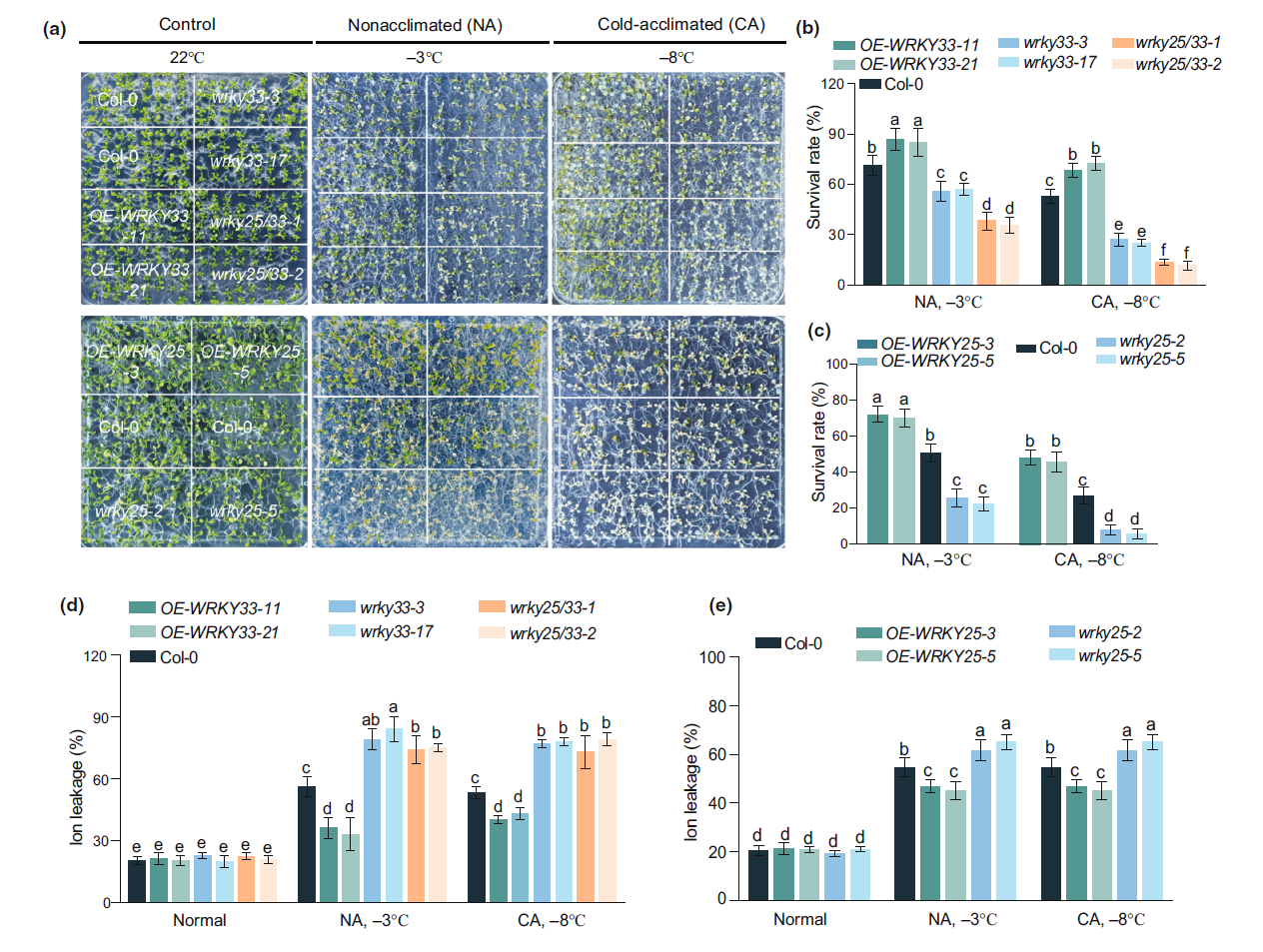 在这22个保守转录因子同源群中,研究人员重点关注了WRKY25/26/33这一组WRKY转录因子。系统发育和表达分析表明,该同源群在多个物种中均表现出明显的低温诱导表达。进一步在拟南芥中进行遗传功能研究发现,WRKY25和WRKY33的突变体在低温条件下表现出更强的敏感性,而过表达植株则具有更高的耐寒能力(图2)。值得注意的是,这种调控作用并不依赖经典的CBF冷响应通路,提示WRKY转录因子可能参与了另一条平行的冷响应调控路径。