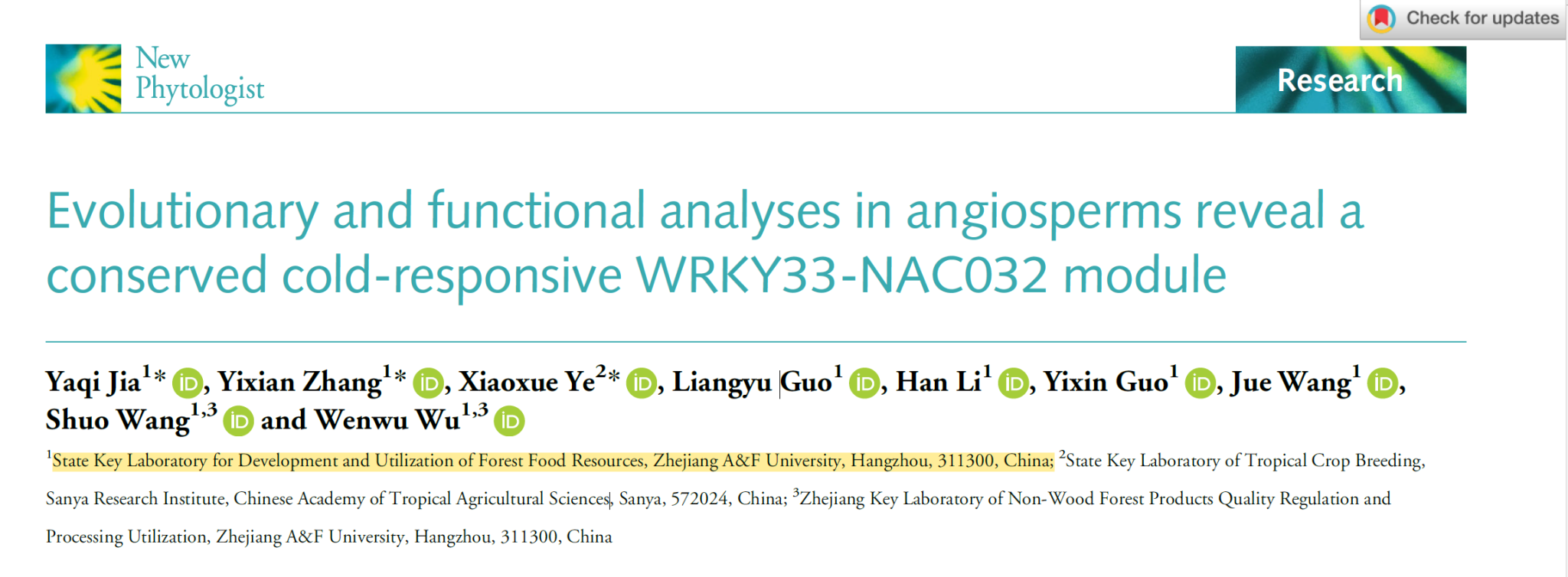 近日,beat365官方网站森林食物资源挖掘与利用国家重点实验室吴文武教授团队以“Evolutionary and functional analyses in angiosperms reveal a conserved cold-responsive WRKY33-NAC032 module”(《被子植物演化和功能分析揭示一个保守的冷响应WRKY33-NAC032模块》)为题,在《New Phytologist》(中科院1区Top,IF-5yr=10.3)发表研究论文,系统揭示了被子植物中保守存在的一个冷响应转录调控模块。