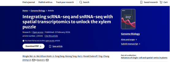 近日,林生院李全梓研究员团队在《Genome Biology》(中科院1区Top,IF-5yr=16.3)在线发表了题为“Integrating scRNA-seq and snRNA-seq with spatial transcriptomics to unlock the xylem puzzle”(《整合单细胞、单细胞核与空间转录组技术探索木质部发育的复杂性》)的研究论文。该研究对杨树茎木质部进行单核RNA测序(snRNA-seq)、单细胞RNA测序(scRNA-seq)以及激光捕获显微切割(LCM-RNAseq)空间转录组数据联合分析,构建了一个涵盖从形成层纺锤状原始细胞到次生细胞壁形成再到细胞程序化死亡的完整木质部发育连续轨迹。这一多模态策略克服了单一技术的局限性,攻克了传统技术无法捕获厚壁成熟细胞的研究瓶颈,为探索植物复杂组织的动态发育过程提供了创新性研究框架。