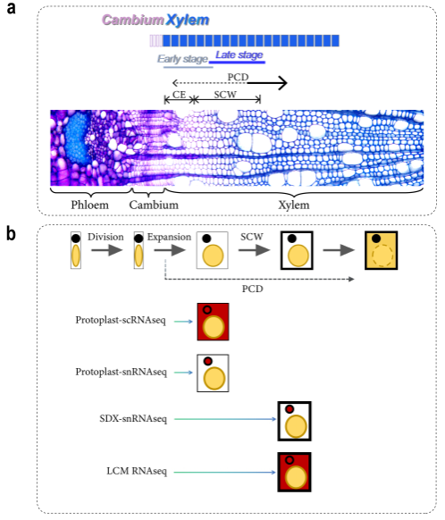 研究发现,scRNA-seq主要捕获早期阶段的薄壁细胞,而snRNA-seq通过机械刮取和细胞核提取,能有效捕获深层、具有厚次生壁的晚期细胞,两种技术在发育中间过渡阶段存在部分重叠,形成高度互补的捕获特性;研究鉴定出木质部中一个转录组学定义的次生壁沉积区(SCW deposition zone),发现该区域同时富集木质素生物合成与细胞程序化死亡相关基因,证实木质部次生壁形成与程序性细胞死亡的启动存在转录水平的协同调控,而非简单的先后序贯关系。