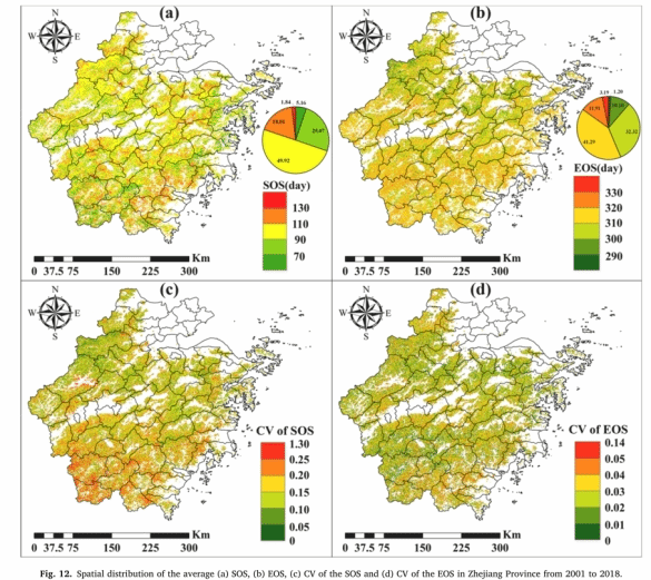 根据所构建的竹林物候遥感反演模型,反演得到近20年浙江省竹林物候时空分布格局。分析表明,浙江省竹林物候具有明显的空间变异特征,SOS具有从西北到东南呈先提前到再延迟的趋势,而EOS具有从西北到东南呈延迟和延长的趋势;从时间上看,近20年浙江省70%左右的竹林SOS具有显著提前趋势,平均每年提前0.83天,60%左右的竹林EOS呈延迟趋势,平均每年延迟0.28天,70%左右的竹林LOS呈延长趋势,平均每年延长1.12天。