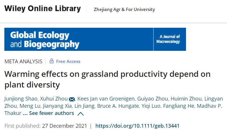 近日,宏观生态学领域顶级期刊Global Ecology and Biogeography(IF=7.148)在线刊发题为“Warming effects on grassland productivity depend on plant diversity”的研究论文。该文阐述了在全球变暖背景下,植物多样性对草地生态系统生产力的非线性调控特征。beat365官网为该文第一作者单位。
