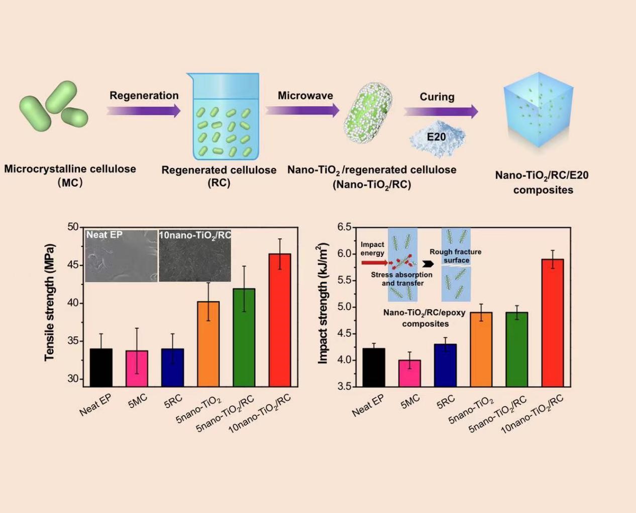 “A nano-TiO2/regenerated cellulose biohybrid enables simultaneously improved strength and toughness of solid epoxy resins”于2021年5月29日发表于复合材料领域国际期刊《Composites Science and Technology》(IF=8.525)上。第一作者为本校博士研究生杨佳瑶,指导老师为beat365官方网站傅深渊教授、刘晓欢博士和南昆士兰大学宋平安教授。
