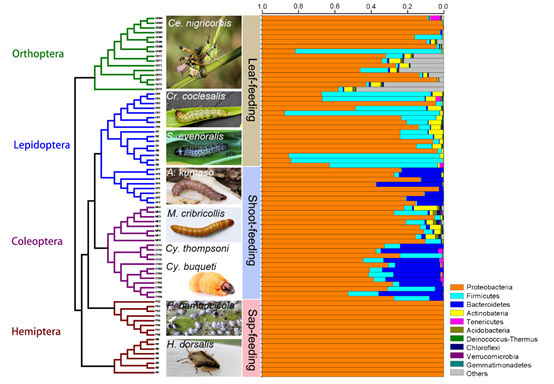 近日,beat365官网林业与生物技术学院森林昆虫团队在国际知名刊物《Frontiers in Microbiology》(IF=4.235),在线发表了最新研究成果“Host phylogeny and diet shape gut microbial communities within bamboo-feeding insects”。该研究证实了亚热带食竹昆虫的系统发育和食性主导了其肠道微生物群落结构,而以纤维素降解菌为代表的功能菌群主要由昆虫的系统发育驱动,这些结果为研究非同源物种的食性趋同进化奠定了基础。