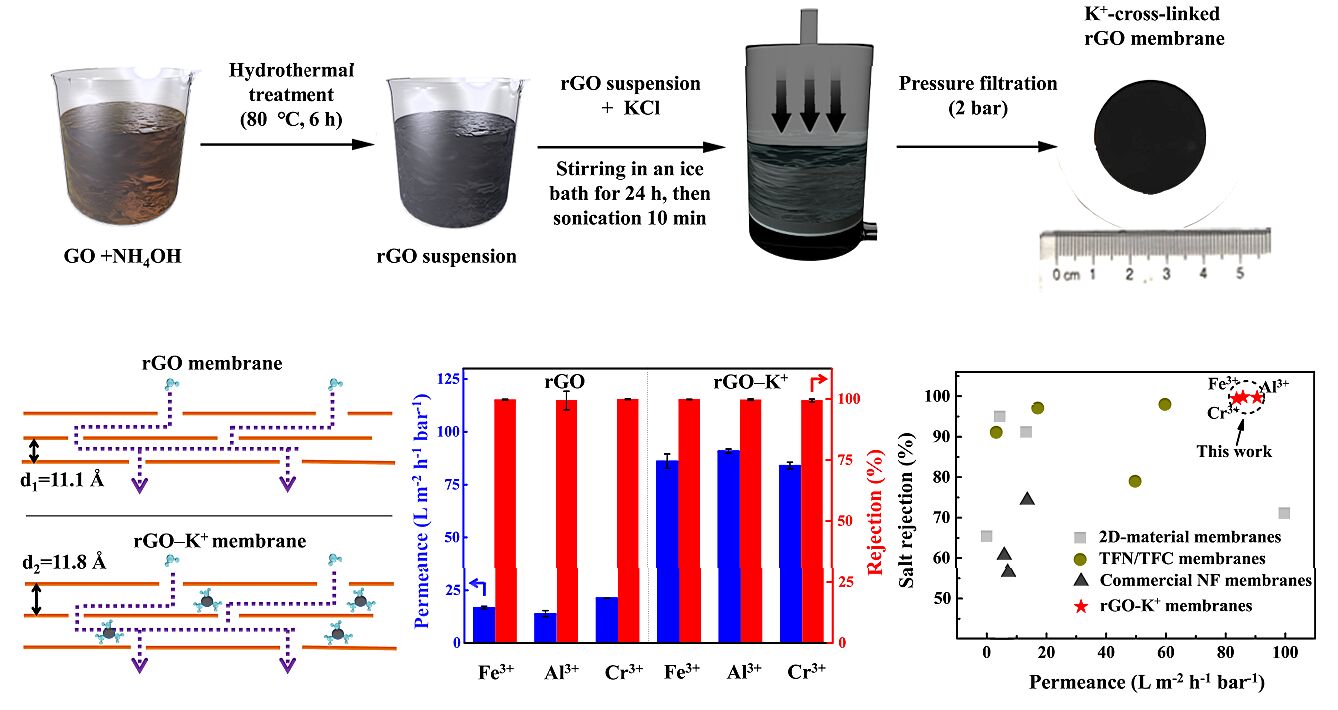 近日,beat365官网光机电工程学院研究团队在国际知名刊物《Journal of Membrane Science》(影响因子7.183),以“Robust reduced graphene oxide membranes with high water permeance enhanced by K+modification”为题在线发表了最新研究成果。该论文第一作者为beat365官网光机电工程学院2019级硕士研究生杨如杰,光机电工程学院教师樊艳博士为共同第一作者,陈均朗副教授和陈亮教授为共同通讯作者。该论文得到了国家自然科学基金委、浙江省自然科学基金委、beat365官方网站校科研发展基金的资助和支持。该工作通过探究水合K+离子对氧化石墨烯膜通道大小调控的物理机理,实现了对高价态离子超高水通量的截留,具有良好的工业化应用前景。
