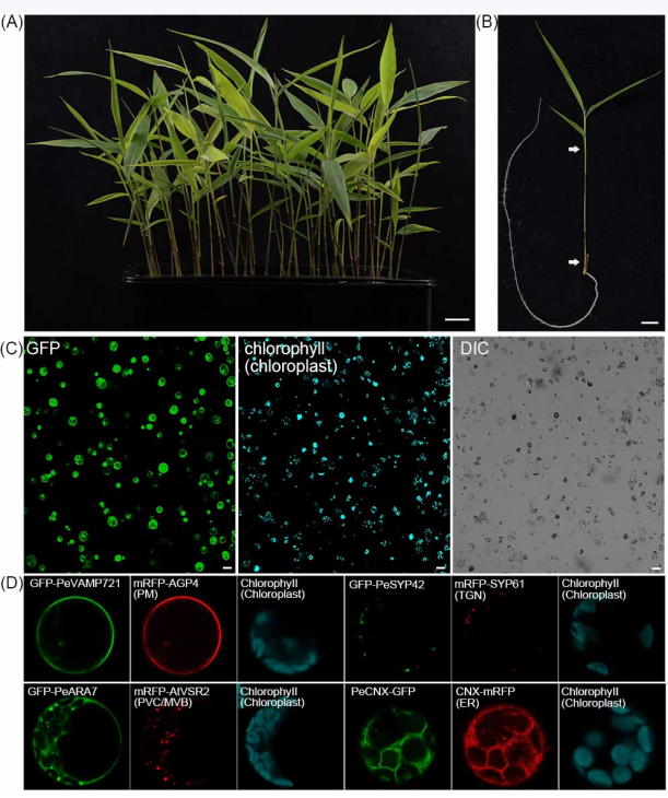 毛竹作为大型禾本科植物,其具有生长速度快,韧性强等生理特点,故具有较高的生态和经济价值。虽然毛竹的基因组测序以及基因注释已经完成,但由于缺少高效的遗传转化体系导致毛竹的研究多集中在生理生化过程,难以深入到细胞分子水平进行多层次研究。研究蛋白的亚细胞定位是解析生物体基因功能的重要手段之一。目前,针对竹蛋白亚细胞定位的研究主要借助于洋葱表皮细胞、拟南芥叶片、水稻叶片或烟草叶的异源瞬时表达体系。由于异源表达系统中存在蛋白序列和蛋白转运调控因子的不保守性,所以异源表达可能导致亚细胞定位错误。