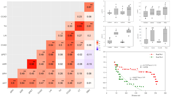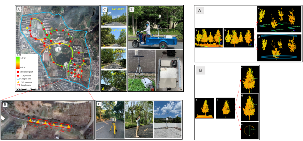 近日,国家重点实验室森林碳汇研究团队(周国模教授团队)在《Agricultural and Forest Meteorology》(中科院1区,IF=5.734)发表题为“Effect of the roadside tree canopy structure and the surrounding on thedaytime urban air temperature in summer”的研究论文。本研究创新性的结合无线传感和激光雷达技术,筛选出行道树冠层3D结构的主要参数,量化了行道树冠层3D结构对城市道路夏季降温增湿和人体舒适度的影响,并通过空间分析和距离分析量化了周围环境的影响,为城市行道树树种选择和空间布局提供了科学依据。