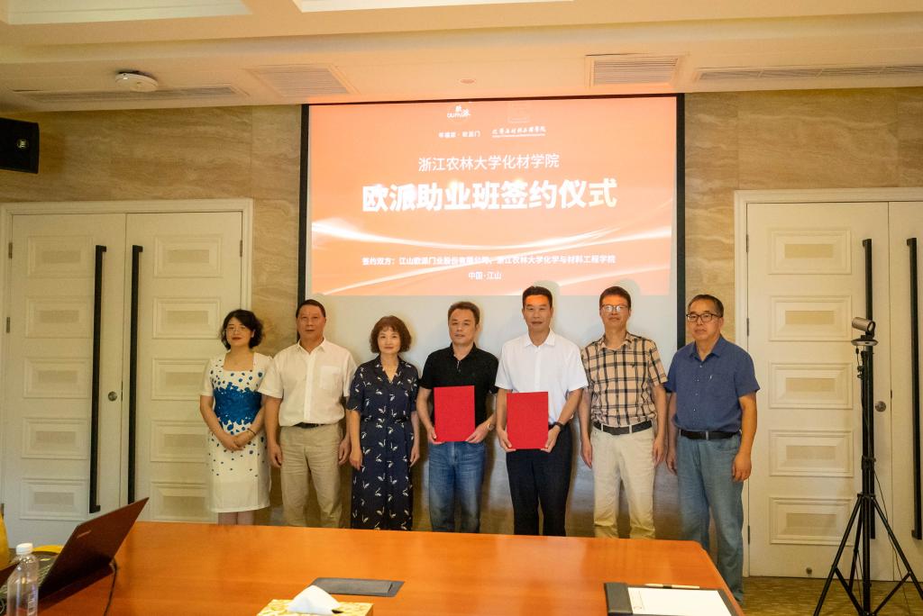 经过前期充分洽谈,当天上午,化材学院与江山欧派门业股份有限公司签署了合作协议,成立“欧派助业班”。签约仪式上,江山欧派门业股份有限公司董事长吴水根表示,“欧派助业班”的设立是校企战略合作的良好开端,双方将进一步拓宽合作领域,落实落细各项内容,全力推动项目落地。