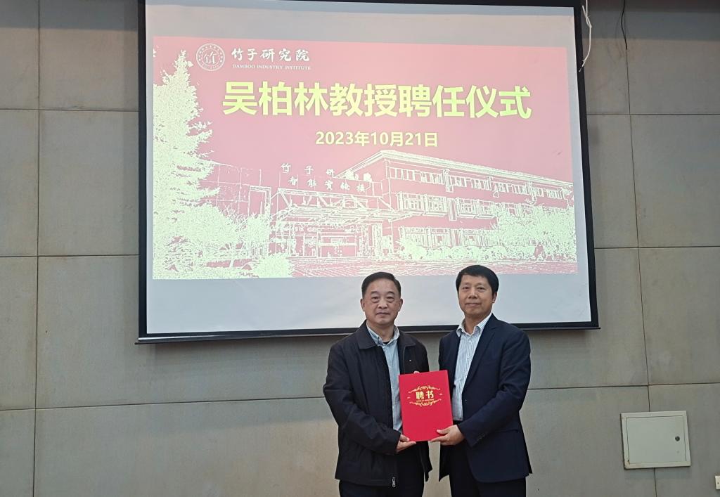 方伟为吴柏林颁发了聘书,并对吴柏林的加盟表示了热烈欢迎和衷心感谢。他表示,吴柏林的加盟将有力提升竹子研究院师资队伍水平,在提升社会服务水平及扩大社会影响力上发挥积极作用,促使学科交叉、三产融合,更好服务竹产业转型升级,促进竹产业高质量发展。