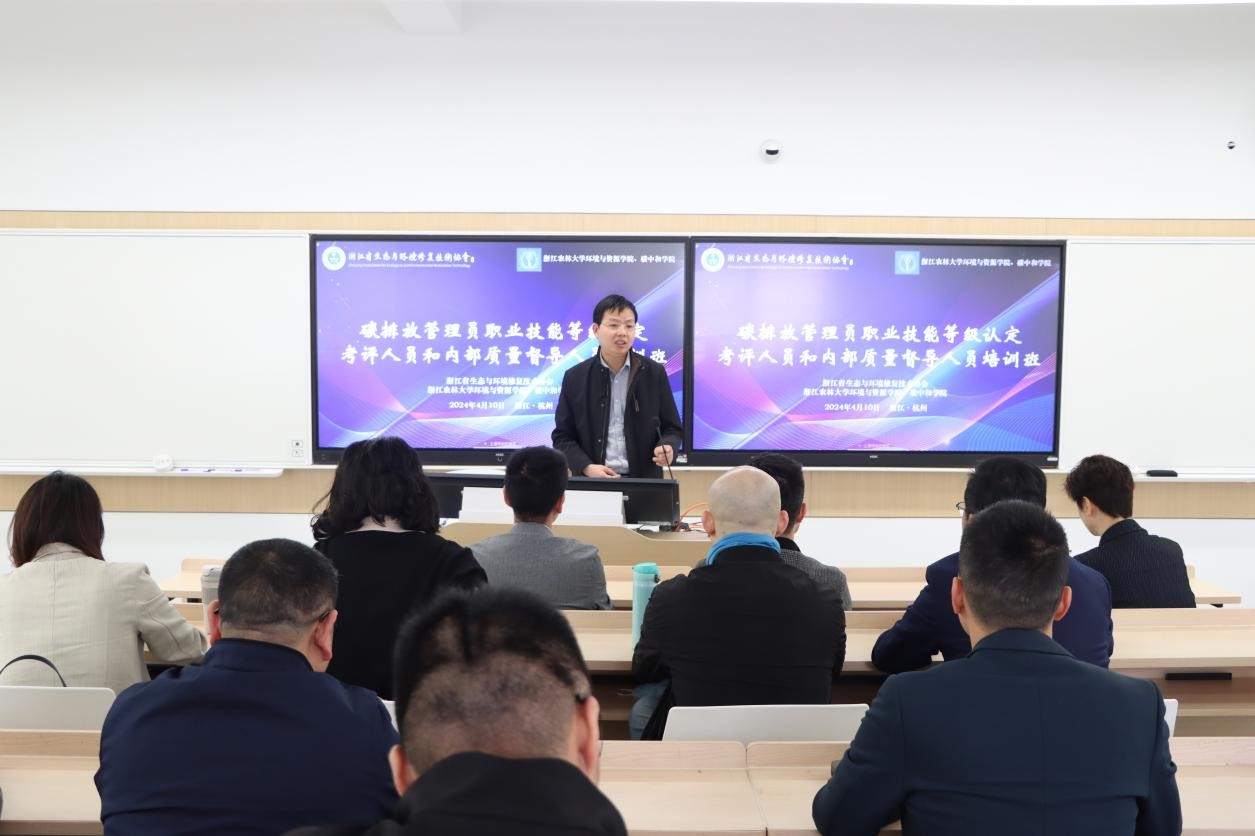 4月10日,由浙江省生态与环境修复技术协会主办,环资院、碳中和学院承办的碳排放管理员职业技能等级认定考评人员和内部质量督导人员培训班在beat365官方网站东湖校区成功举办。环资院、碳中和学院张成、董达、周昕彦等教师参加培训。