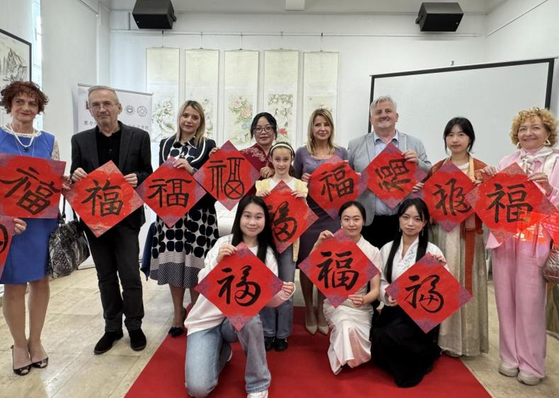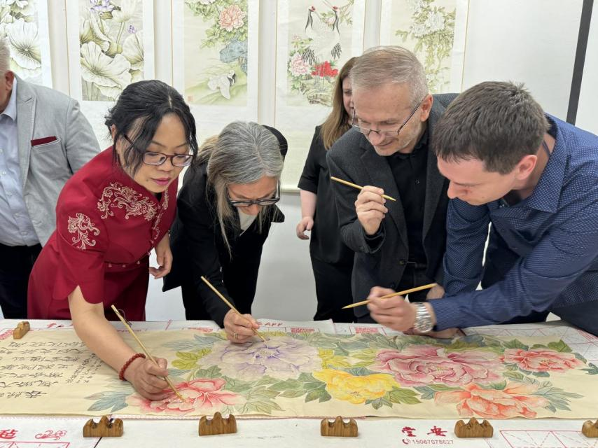 随后,中塞嘉宾共同挥毫,合作完成了一幅牡丹国画长卷《锦簇丹霞映双盟》。活动现场还设置了“写福字、纳百福、赠友人”环节。中塞嘉宾书写不同字体的“福”字互赠,寄托对彼此的美好祝愿。此外,品茶、剪纸、书法和穿汉服等文化体验让来宾沉浸式感受中华传统文化魅力,进一步拉近了两国民众的距离。画展特别精选70幅工笔牡丹佳作,于5月22日至6月4日在伏伊伏丁那档案馆展出,作品皆出自诺大孔院国画班学员之手。