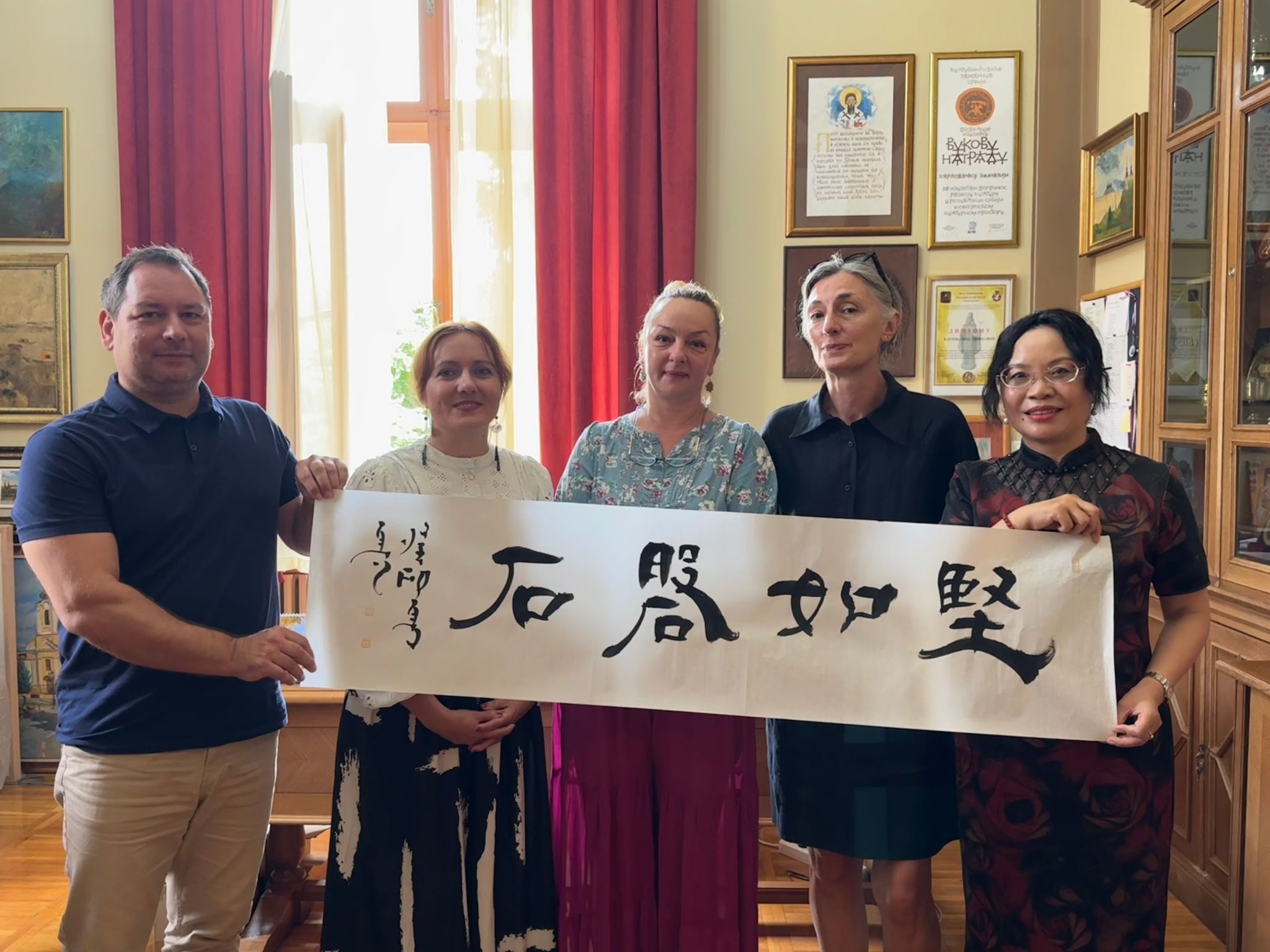 结束后,陈秀向卡尔洛夫茨语言高中赠送书法作品《坚如磐石》,传递美好情谊。