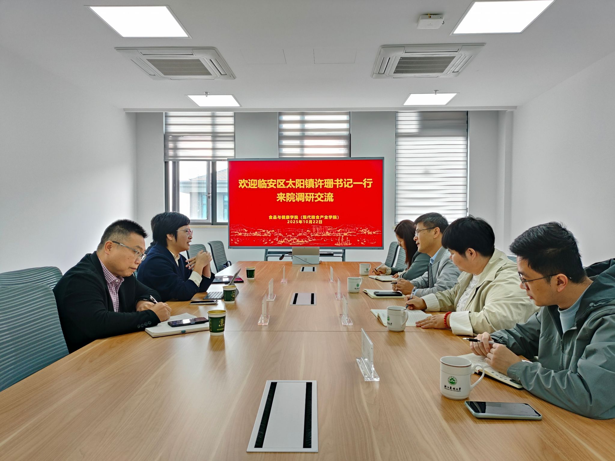 10月22日上午,临安区太阳镇党委书记许珊、镇长凌震等一行来食健学院调研交流,推进校地产学研合作。食健学院党委书记朱军及相关专业教师参加交流会。