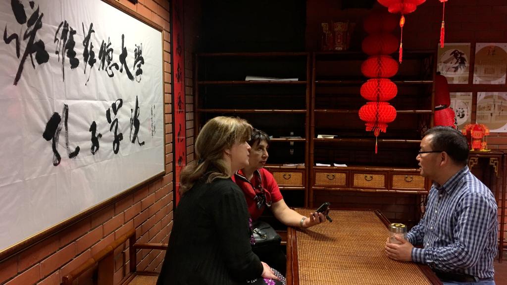 记者艾玛·戈拉亚兰(Ema Grajlan)来到孔院的时候,正值学生们在学习中国书画课。有一群学生来自匈牙利,她们在诺大孔院学了近三年的的中国画,被中国画的“写意”和“工笔”深深吸引;志愿者老师采用“诗词与绘画”相结合的教学法,让学生们在绘画中体会了中国诗词之美。学生蔻瓦兹·哈亚娜卡(Kovac Hajnalka)在接受采访时畅谈了她对中国画的喜爱。