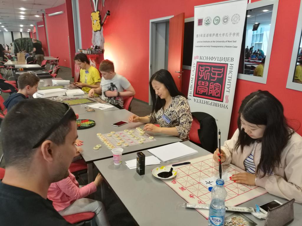 在游戏体验区,孔院老师准备了跳棋、象棋等中国特有的棋类游戏,当地民众们对中国棋类表现出了浓厚的兴趣,踊跃参加,相互竞赛;在文化展示区,孔院老师则展示了中国传统书法,现场为民众写名字,民众们赞不绝口;孔院本土汉语教师娜塔莎(Natasha)作了“中国龙”的文化讲座。