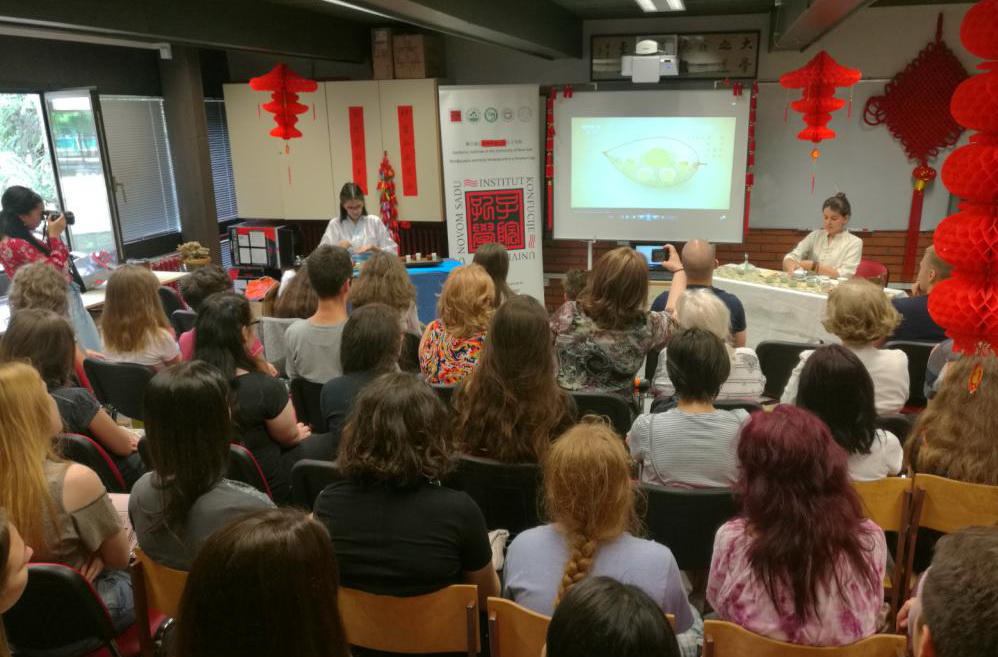 诺大孔院优秀学员妮娜(Nina Krstić)、中国茶艺铁杆粉丝吉吉(Srdjana Petrovic)分享了学习汉语和茶艺的心得,并表演了精湛优雅的茶艺。参加过孔院赴华夏令营的泰天(ALeksandar Vujic)和有过中国学习经历的天乐(Igor Makaric)分享了各自在中国的见闻。泰天还和诺大孔院老师一起现场展示了书法、写意中国画和剪纸等。大家都被中国文化表演所吸引,纷纷用手机记录下精彩的瞬间。