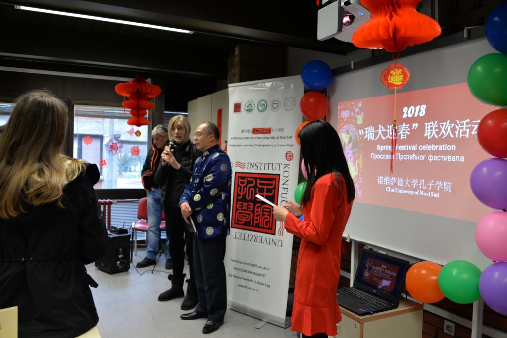 活动伊始,诺大孔院外方院长伊凡娜·捷万契维奇·赛凯露丝(IvanaŽivančević-Sekeruš)和中方院长陈晦分别致辞,表达了对中国新年到来的温馨祝福和美好期盼,并鼓励学生们学好汉语,通过节日文化更多了解中国,做文化交流的建设者和中塞友谊的传承人。