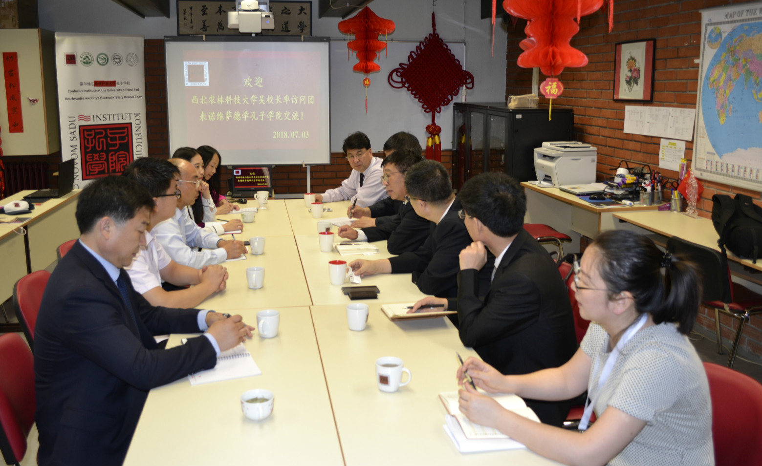 当地时间7月3日,西北农林科技大学校长吴普特、副校长罗军一行8人到塞尔维亚诺维萨德大学孔子学院访问,就孔子学院自身建设、项目申报、当地的汉语教学及中国文化推广工作进行了座谈交流。