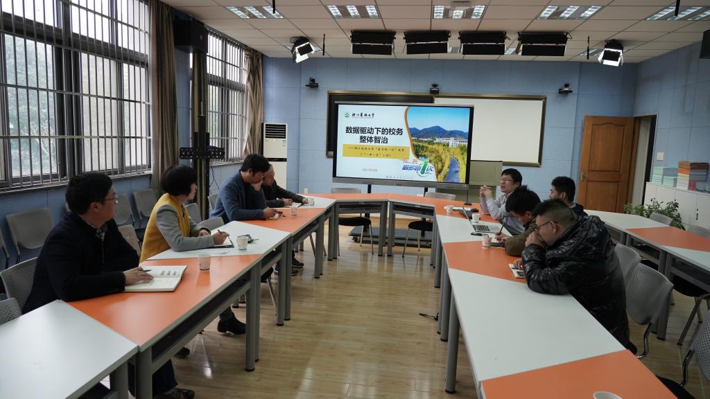 信息中心相关负责人对郭晓梅一行的来访表示欢迎,并从数据驱动下的校务整体智治角度,介绍了学校信息化建设的基本情况和“一库一表”建设过程中取得的经验及成效。