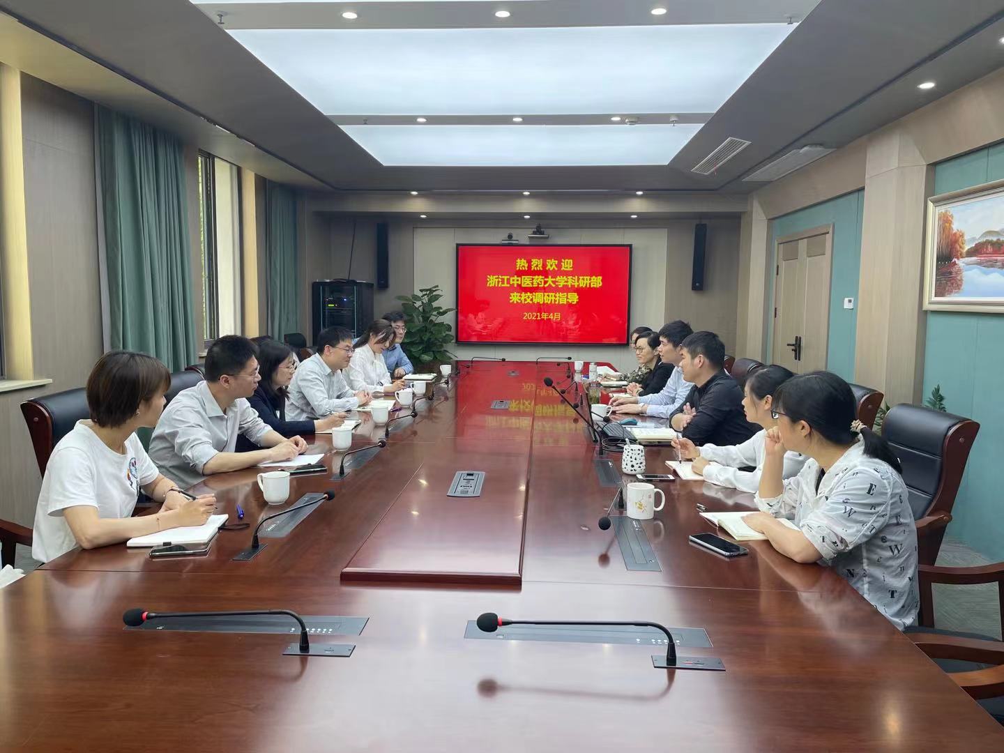 4月29日,浙江中医药大学科研部王辉常务副部长一行七人来校调研,科技处相关负责人及相关工作人员参加座谈。