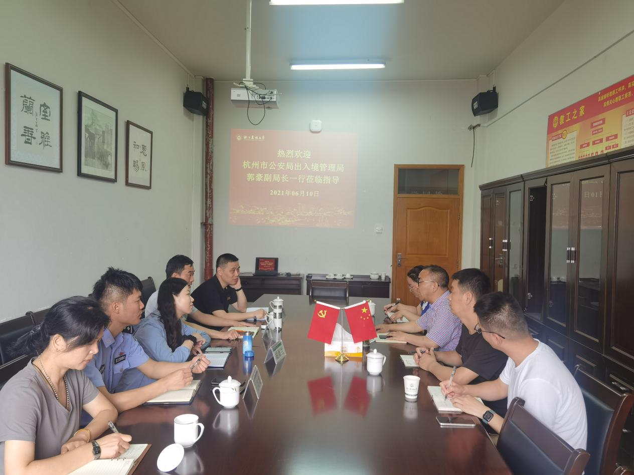 近日,杭州市公安局出入境管理局副局长郭豪一行来beat365官网就来华留学生签证、推行杭州市市民卡国际版和校内管理等相关事宜进行调研和指导。