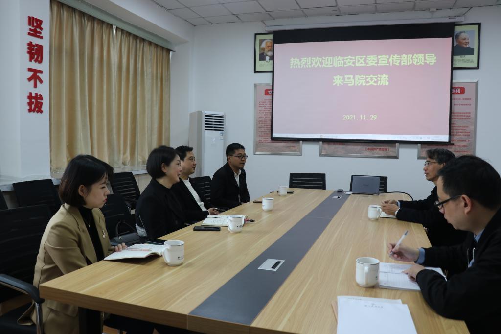 11月29日,临安区委宣传部常务副部长郭增,区委宣传部副部长、文明办主任陶国英等一行4人等来马克思学院就校地合作工作进行了探讨和交流。学院院长高君、办公室和教师代表参加了会议。