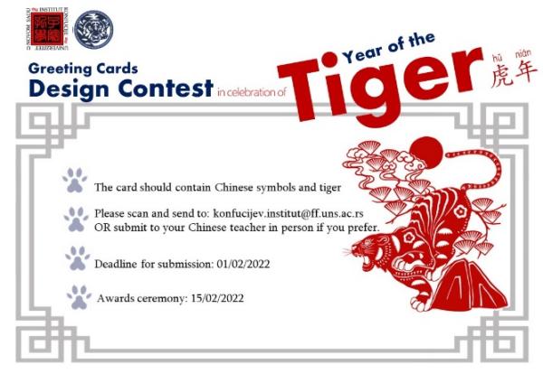 2022年虎年春节,受当地疫情影响,往年广受欢迎的线下庆祝中国新年活动无法举办,为延续这一当地民众喜闻乐见的传统,塞尔维亚诺维萨德大学孔子学院特地举办了虎年春节贺卡设计大赛,得到了当地中小学、大学、孔子课堂学生和社会民众的热烈响应,120余人提交了参赛作品。