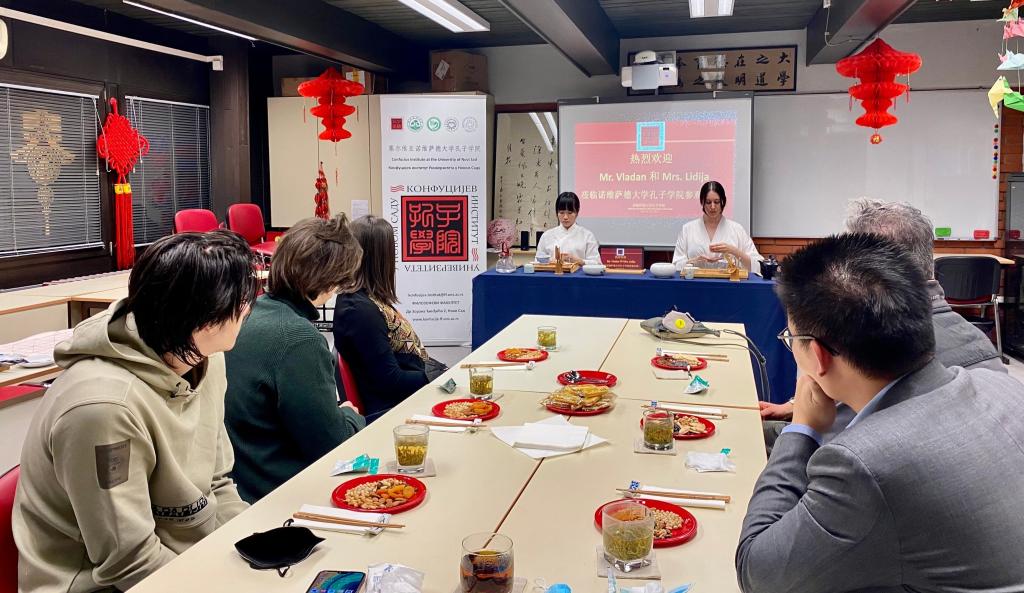 茶文化课志愿者教师程湘珉与上学期优秀学员米拉·阿夫拉莫维奇(Mila Avramović)合作表演茶艺。鉴于疫情原因,结合诺大校园的防疫政策,几位参与者经过自愿报名、提交疫苗接种证明、测温和消毒程序之后,才获批进入学院大楼进行线下体验。在悦耳的古琴乐韵中,孔院师生为初次慕名到访的客人奉上了一杯迎客茶,激起了在场学员浓浓的兴趣。